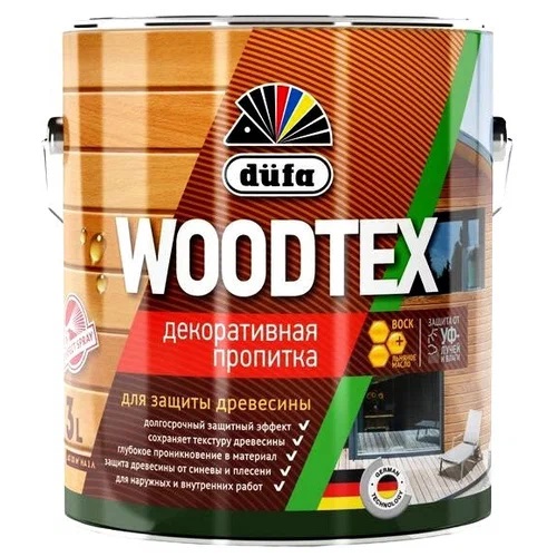 Пропитка защитная Dufa декоративная алкидная WoodTex - эффективное средство на алкидной основе для декоративной отделки и долговечной защиты поверхностей из любых пород древесины. Применяется для обработки внутренних и наружных поверхностей: деревянных фасадов домов, срубов, заборов, дверей, оконных рам и других конструкций из дерева, фанеры, ДСП, ДВП, ОСП. Защитное средство проникающего типа: сохраняет дышащие свойства древесины. Пригодно для регулярного ухода за древесиной без сложной подготовки.