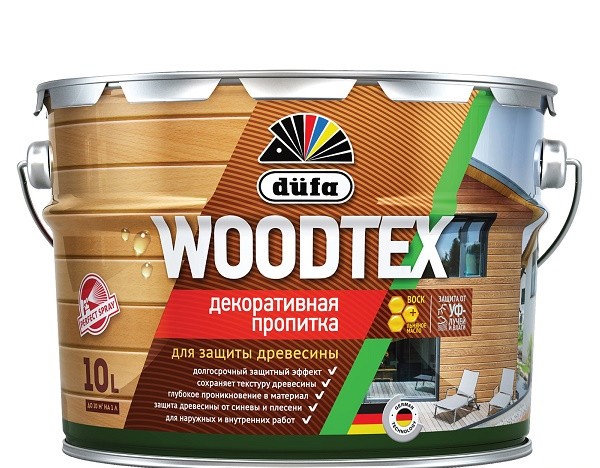 Декоративно-защитная пропитка Dufa Woodtex сочетает в себе лучшие качества алкидного антисептика, натуральных масел и твёрдого воска, обеспечивая надёжную и длительную защиту деревянному дому. Специальные антисептические добавки в составе пропитки гарантируют защиту от различных видов биопоражений, являющихся характерной проблемой для деревянных строений. Наличие в составе пропитки УФ-абсорбентов и специальных добавок (твердого воска и масел), обеспечивают защиту от выгорания цвета и атмосферостойкость покрытия, выполненного Woodtex.