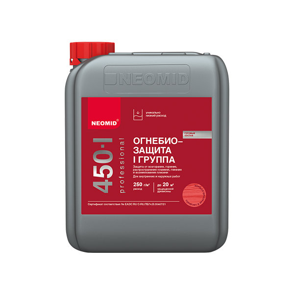 Средство для огнебиозащиты древесины «Неомид 450-1» – высокоэффективное средство для огнезащиты и антисептирования древесины для наружных и внутренних работ в условиях, исключающих вымывание состава с обработанной поверхности. Переводит древесину в трудновоспламеняемый и трудногорючий материал, обеспечивая I (первую) группу огнезащитной эффективности по ГОСТ Р 53292, защищает от гниения, возникновения плесени.
