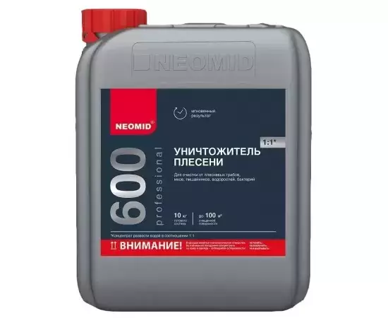 Уничтожитель плесени Neomid 600, 10 кг - Состав для эффективного и быстрого удаления плесени внутри и снаружи помещений. Быстро уничтожает грибы, мхи, лишайники, водоросли. Удаляет серый налет с бетона, кирпича, камня, межплиточных швов и других минеральных поверхностей.