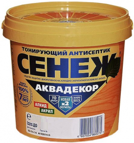 Антисептик СЕНЕЖ АКВАДЕКОР предназначен для долговременной защиты древесины от атмосферных осадков, плесневых, деревоокрашивающих и дереворазрушающих грибов, водорослей и насекомых-древоточцев, а также декоративной отделки под ценные породы. Сочетание в СЕНЕЖ АКВАДЕКОР алкидов, акрилатов и льняного масла улучшает проникновение в древесину, формирует эластичное дышащее защитное покрытие с мягким шелковистым блеском.