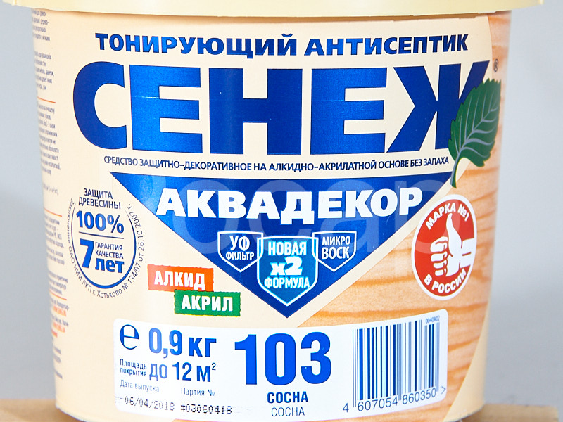 Антисептик СЕНЕЖ АКВАДЕКОР предназначен для долговременной защиты древесины от атмосферных осадков, плесневых, деревоокрашивающих и дереворазрушающих грибов, водорослей и насекомых-древоточцев, а также декоративной отделки под ценные породы. Сочетание в СЕНЕЖ АКВАДЕКОР алкидов, акрилатов и льняного масла улучшает проникновение в древесину, формирует эластичное дышащее защитное покрытие с мягким шелковистым блеском.