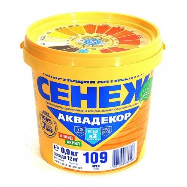 Антисептик СЕНЕЖ АКВАДЕКОР предназначен для долговременной защиты древесины от атмосферных осадков, плесневых, деревоокрашивающих и дереворазрушающих грибов, водорослей и насекомых-древоточцев, а также декоративной отделки под ценные породы. Сочетание в СЕНЕЖ АКВАДЕКОР алкидов, акрилатов и льняного масла улучшает проникновение в древесину, формирует эластичное дышащее защитное покрытие с мягким шелковистым блеском.