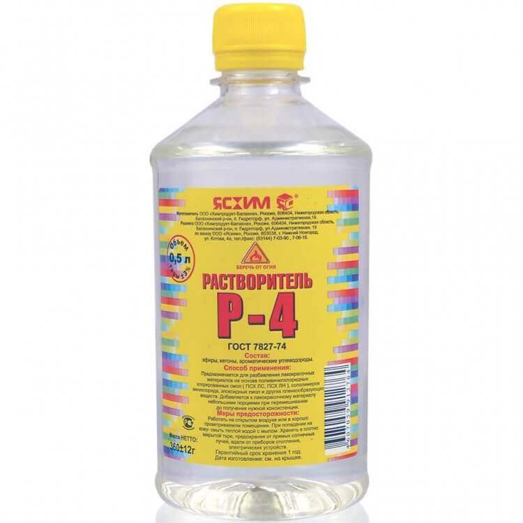 Растворитель Р-4 используется для очищения поливинилхлоридных поверхностей от эмали, лака, нитролака. Применяют для разбавления лакокрасочных изделий, эпоксидных смол и некоторых других химических веществ. Он быстро разводит эмали, лак до нужной густоты перед окраской.