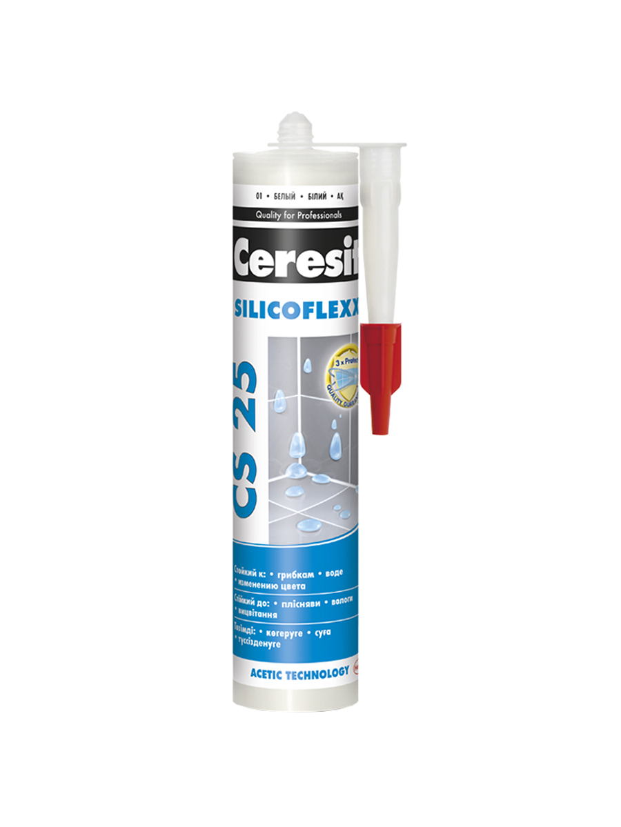 Цветная однокомпонентная силиконовая затирка кислотного отверждения CS 25 применяется для внутренних и наружных работ. Затирка водостойкая, эластичная, обладает высокой адгезией к фарфору, стеклу, фаянсу, эмалированным поверхностям. Обладает высокой стойкостью к УФ-излучению и озону, обладает противогрибковым эффектом, благодаря формуле Trio Protection. Экологически безопасна.