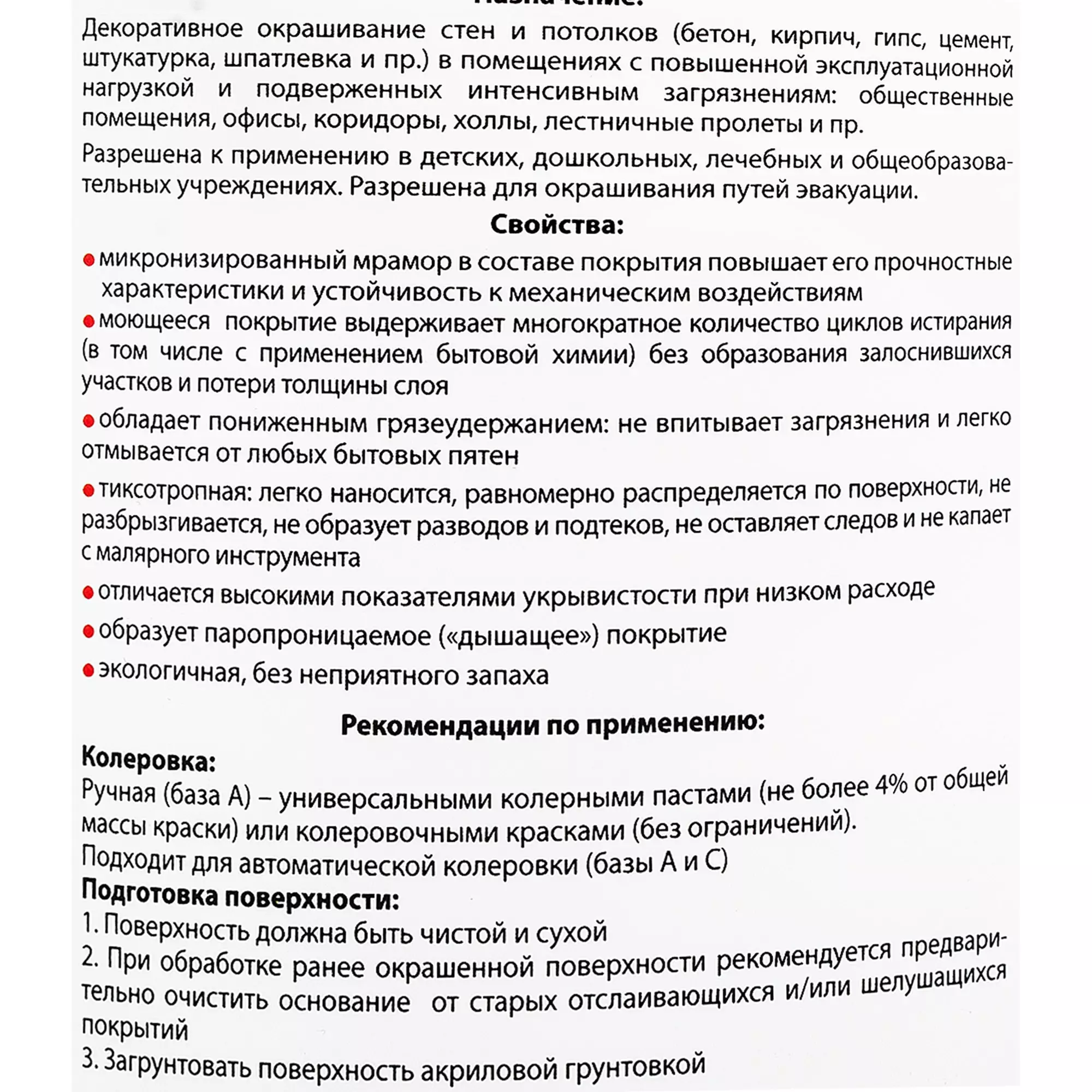 Разрешена к применению в детских, дошкольных, лечебных и общеобразовательных учреждениях. Разрешена для окрашивания путей эвакуации.