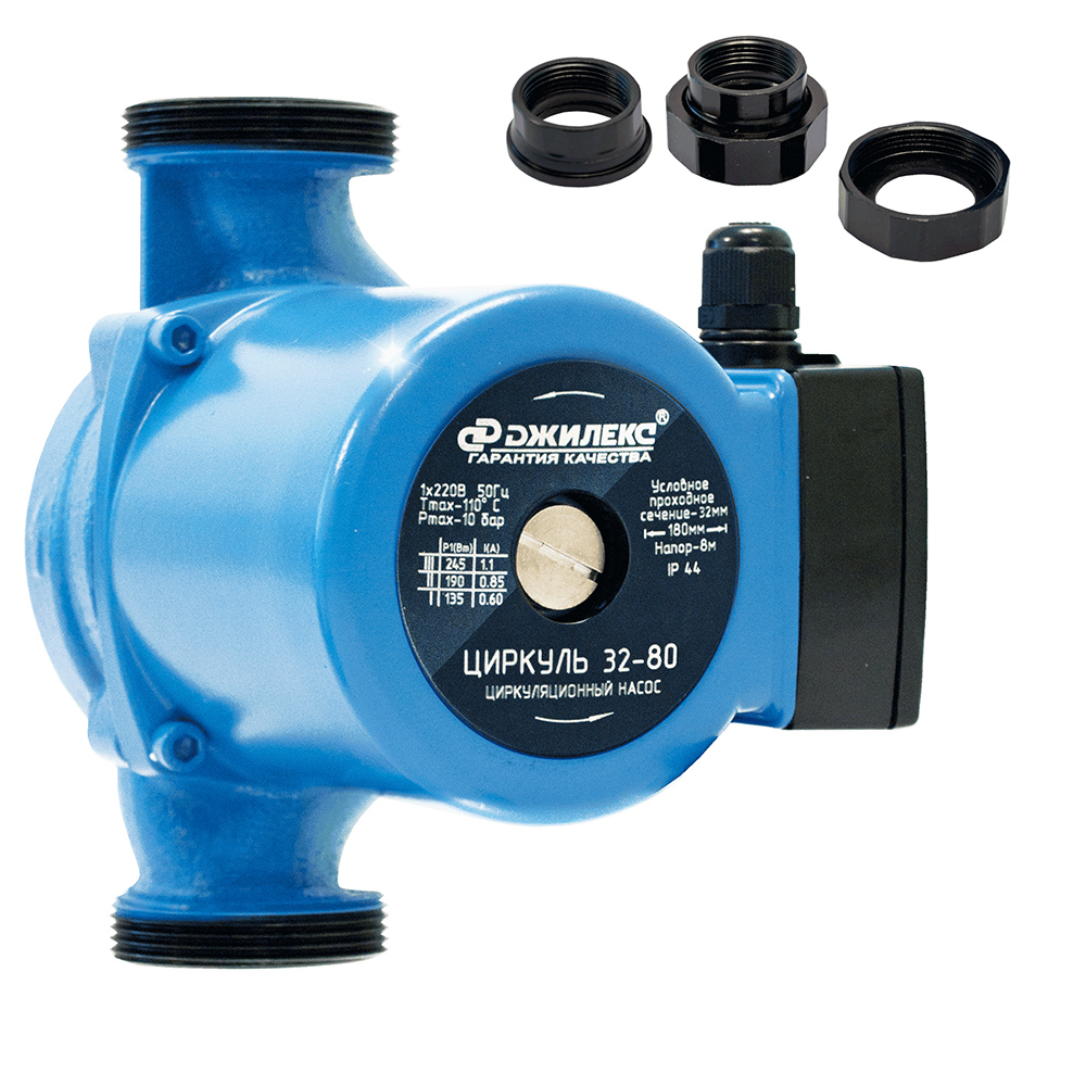 Циркуляционный насос Джилекс Циркуль 32/80 предназначен для циркуляции воды или теплоносителя в системах отопления с присоединительным размером гайки 1 1/4 дюйма (32 мм) и максимальным напором 8 метров (80 дм).