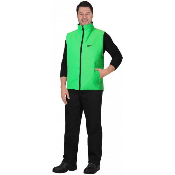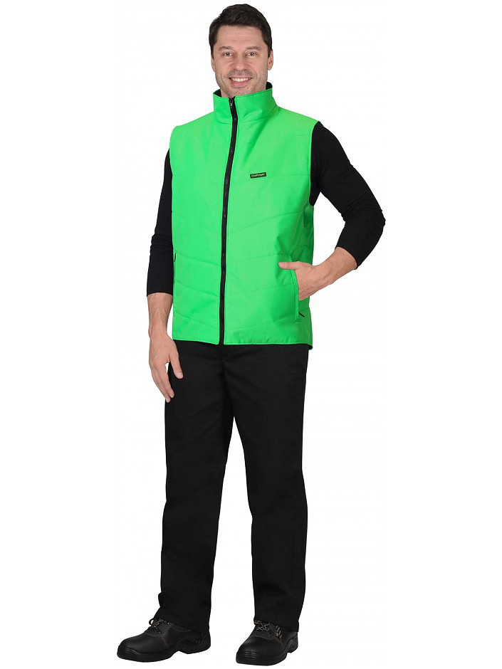Жилет стеганный, полуприлегающего силуэта, с центральной бортовой застежкой на тесьму "молния", с воротником стойка, с нижними прорезными карманами в рамку на тесьме "молния", с внутренним карманом застегивающийся на тесьму "молния".
