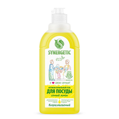 Биоразлагаемый концентрированный гель для посуды с антибактериальным эффектом SYNERGETIC - это экологичное, безопасное и эффективное средство для мытья всех видов посуды, в том числе детской, кухонного инвентаря и детских игрушек от любых видов загрязнений. Он не оставляет следов на посуде. Мягкие биоразлагаемые тензиды из растительного масла обеспечивают хорошее пенообразование и эффективно удаляют жир и запахи даже в холодной воде. Глицерин растительного происхождения в составе средства защищает кожу рук от сухости и раздражения. Гипоаллергенная парфюмерная композиция на основе эфирных масел лимона, померанца, петитгрейна, лемонграсса и лайма придает средству свежий и приятный аромат. Гель дерматологически протестирован в Европе. Международный экологический сертификат ICEA подтверждает биоразлагаемость, безопасность и эффективность средства. Биоразлагаемые компоненты безопасны для природы и человека и не вредят микрофлоре септических установок при использо