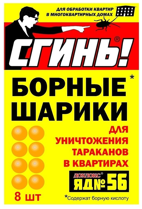 Борные шарики — это самое известное народное средство от тараканов. В него входит настоящая борная кислота и фирменная пищевая приманка с ядом «Дохлокс № 56». Так что теперь это старое испытанное средство по уничтожению тараканов стало ещё более эффективным и безотказным. Шарики следует вынуть из упаковки и разместить в местах появления и передвижения тараканов. Желательно не помещать в пыльные места. Состав: вспомогательные компоненты 94 %, фипронил 6 %.