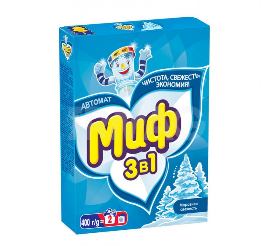 В состав Мифа входит целый ряд компонентов, благодаря которым белье после стирки становится чистым и свежим. Так, например, в Мифе несколько типов поверхностно-активных веществ, которые отвечают за удаление общих загрязнений. Силикаты надежно защищают поверхность ткани и механизмы стиральной машины во время стирки, а энзимы удаляют сложные пятна, которые не выводятся обычными порошками — кровь, молоко, шоколад, желток и другие. В состав Мифа также входят специальные отбеливатели — фотоотбеливатель и оптический. Благодаря их действию сохраняются яркие, натуральные цвета тканей.