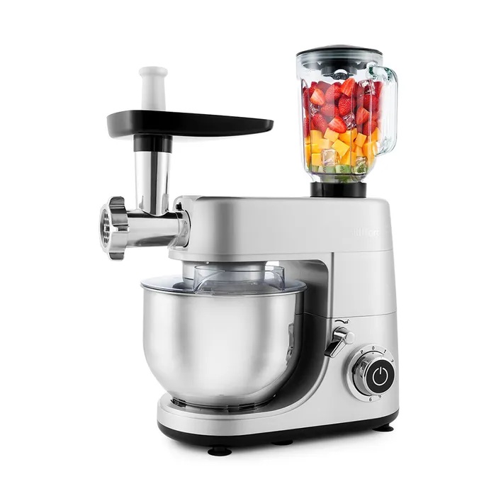 В миксере предусмотрена плавная регулировка скорости вращения, поэтому вы всегда можете выбрать оптимальный скоростной режим. Импульсный режим работы можно использовать для особенно высокой мощности. Вместительная стальная чаша Миксер оснащён вместительной чашей 6 л. Форма насадок и чаши подобраны так, чтобы при любом количестве продуктов насадка не оставляет их по краям не перемешанными. А благодаря крышке, можно не бояться брызг и добавлять ингредиенты прямо во время работы. Мощность 1000 Вт Ёмкость чаши 6 л Материал чаши нержавеющая сталь Мощность блендера 335 Вт Ёмкость чаши блендера 1,5 л Материал чаши блендера стекло Производительность мясорубки 1,2 кг/мин Длина сетевого шнура 1 м Размер прибора 412 х 254 x 352 мм Вес прибора 9,1 кг Количество скоростей 6
