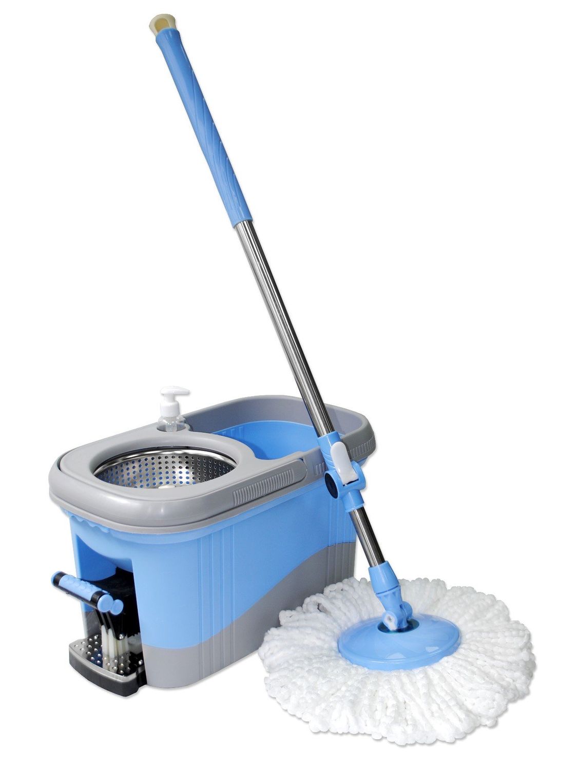 Полоскание и отжим МОПа обеспечивает вращающаяся телескопическая ручка. Высота 87 - 112 см. Имеет специальный фиксатор для регулирования высоты. Круглая платформа, на которой крепится МОП, вращается относительно оси ручки, что позволяет производить уборку в труднодоступных местах (например, под мебелью).