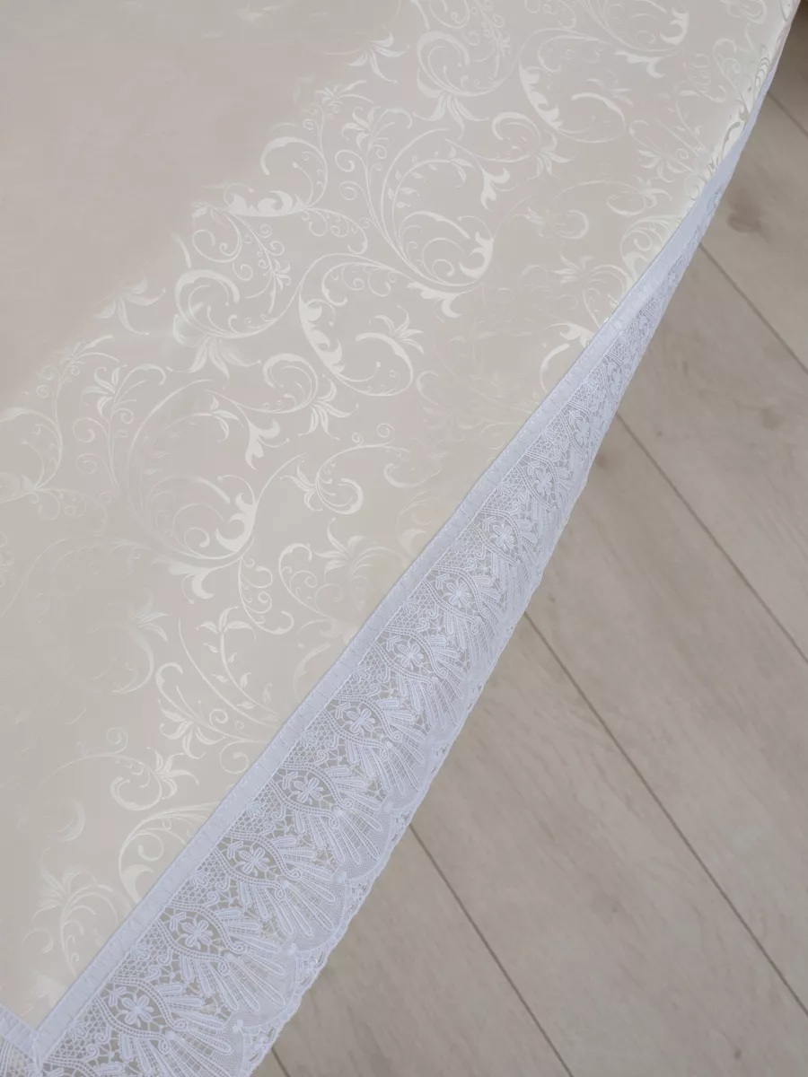 Элегантная скатерть в теплых тонах айвори, обрамленная белой каймой, создаст атмосферу комфорта. Прекрасно подходит как для праздничных мероприятий так и для повседневного использования. Не впитывает загрязнения и запахи, легко ухаживать.