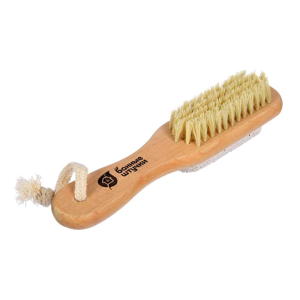 Деревянная щеткая предназначена для использования в душе или сауне. Эффективно очищает и массажирует кожу, обновляя ее. Пемза со второй стороны поможет сделать более гладкой кожу ваших стоп.