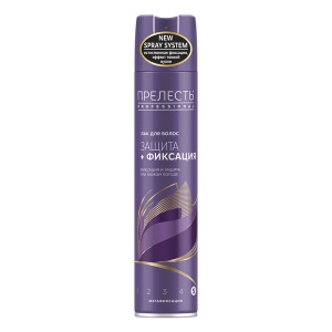 Средство для волос серии Защита содержит натуральный экстракт виноградной косточки и провитамин В5, которые оказывают мощное антиоксидантное и укрепляющее действие на волосы, делая их неуязвимыми и защищая от самых агрессивных внешних воздействий. • Лак надежно фиксирует укладку и не склеивает волосы. • Придает дополнительный блеск. • Защищает волосы от погодных условий и негативного воздействия внешней среды. • Легко удаляется с волос расческой. • Степень фиксации: 5 (мегафиксация). В состав всех средств для укладки волос Прелесть Professional включен комплекс DiProFactor, который сочетает в себе современные фиксирующие компоненты и витамины, благодаря чему обеспечивается двойной усиленный эффект – длительная естественная фиксация без склеивания волос и защита прически в любых климатических условиях.