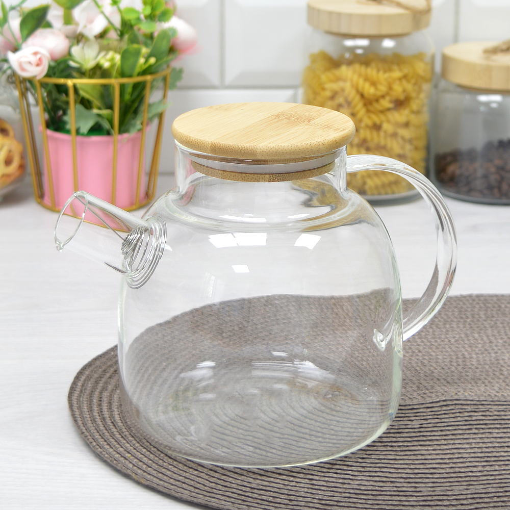 Стильный стеклянный чайник впишется в любой интерьер кухни и дополнит его. Бамбуковая крышка придает ему лаконичность и универсальность.