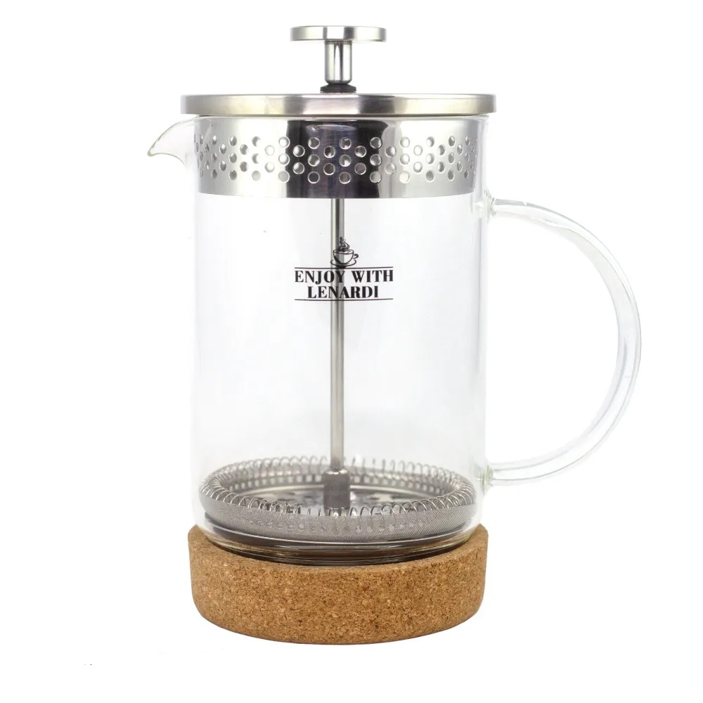 Высота 22 см, диам 10 см Френч-пресс со стеклянной колбой. Прочная колба из боросиликатного стекла устойчива к перепадам температуры, подставка из пробки создает нескользящий эффект, подставка съемная Подходит для чая и кофе, травяных отваров, горячих ягодных напитков со смородиной, малиной, облепихой, брусникой или шиповником. Прозрачная колба из прочного боросиликатного стекла позволяет наблюдать за процессом заваривания. Несмотря на то, что заварка засыпается в колбу, итоговый напиток всегда получается чистым. Поршень плотно прижимает заварку ко дну. Чайник без проблем отмывается вручную, а также в автоматических посудомоечных машинах. Комплектующие изделия -надежные и безопасные материалы. Стекло, нержавеющая сталь, пробка