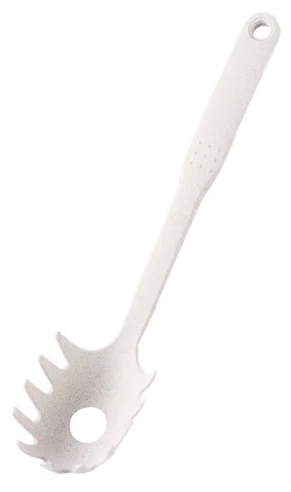 Ложка для спагетти — это один из незаменимых столовых приборов на кухне. Благодаря её зубчикам по краям спагетти не скатываются с ложки и не ломаются. А лишняя жидкость стекает через небольшое отверстие. Также ложкой для спагетти удобно не только насыпать, но и перемешивать еду во время готовки.