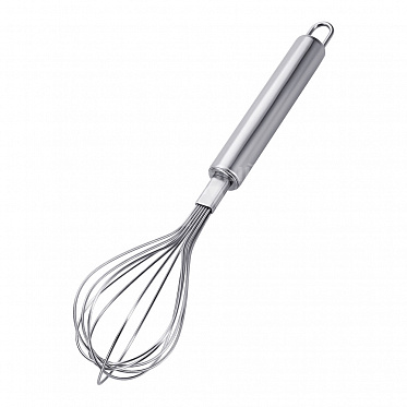 Ручной венчик для взбивания - базовый атрибут для ежедневного использования на кухне каждой хозяйкой. С помощью венчика можно взбить мусс, яйца, сливки, белки, жидкое тесто или соус. Стильный дизайн венчика впишется в интерьер любой кухни. Венчик для взбивания яиц выполнен из нержавеющей стали, что позволяет ему сохранять прочность и долговечность, не впитывает запахи, легко моется, в том числе и в посудомоечной машине. Ручка венчика металлического не выскользнет из рук, а количество струн идеально подобрано для максимального удобства взбивания не только продуктов, но и жидких консистенций. Также венчик для взбивания имеет петельку на конце, чтобы можно было повесить изделие там, где необходимо. Размер: 26 х 5 см