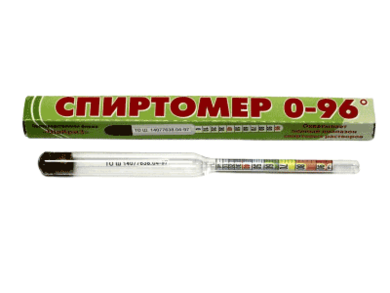 Спиртомер – это устройство, предназначенное для определения массовой относительной доли спирта (крепости) этиловых дистиллятов. Устройство погружного поплавочного типа представляет с собой колбу из тонкого каленого стекла, в нижней части которой предусмотрено расширение. На дне колбы сургучом запаяно определенное количество металлической дроби, а все остальное пространство заполнено воздухом. В верхней зауженной части изделия находится шкала от 0 до 96 % с разноцветными зонами для более удобного считывания результатов.