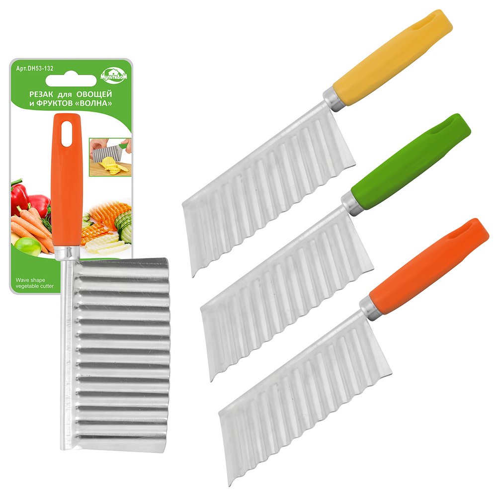 Используйте нож для волнистой нарезки и украшайте ваши блюда ломтиками овощей, фруктов и сыра. Слайсер для овощей и фруктов «Волна» — настоящая находка для тех, кто любит удивлять оригинально оформленными угощениями. Нарежьте картофель волнами и зажарьте во фритюре или сделайте красивую нарезку из огурцов или редиса. Волнистые кусочки будут отлично смотреться в горячих блюдах, на бутербродах или в оформлении холодных закусок. Инструмент используется как обычный нож, просто держите его за ручку и разрезайте продукты. Лезвие изготовлено из коррозионностойкой стали, ручка выполнена из пластмассы (полипропилен). Помыть резак можно проточной водой с использованием моющих средств.