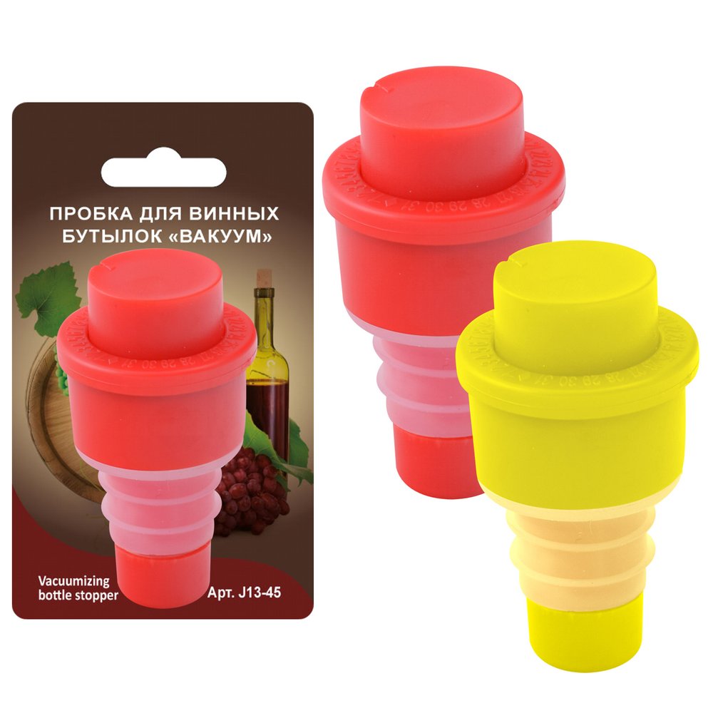 Во время вечеринок или для хранения бутылок с содержимым используйте пробку «Вакуум». С помощью этой пробки можно закрыть бутылку вина, шампанского, бутылку с уксусом или маслом. Внутрь не попадут посторонние запахи, пыль и содержимое не выветрится. Изделие актуально для использования дома, в баре, кафе, во время поездок и пикников. Приспособление подойдет для горлышек стандартного диаметра, предназначено для многоразового использования, изготовлено из полимерных материалов (силикон и полипропилен). Представлено в двух цветах: в красном и желтом.