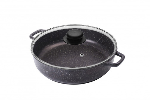 Также в ней можно приготовить плов рагу, жаркое или даже испечь пирог. «Гранит». Коллекция посуды с улучшенным четырёхслойным антипригарным покрытием. Дополнительный слой с мраморным эффектом увеличивает износостойкость и создаёт оригинальный оттенок чёрного мрамора. Литой пищевой алюминий не имеет канцерогенных веществ и посторонних запахов. Толстые стенки и дно обеспечивают равномерное приготовление блюда.