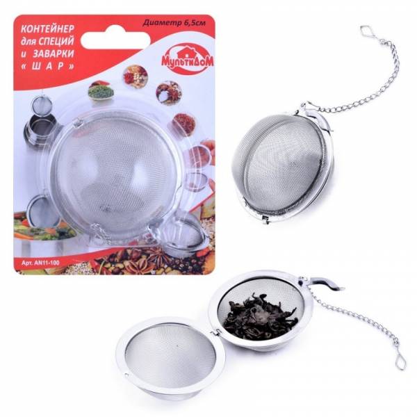 Контейнер в форме шара поможет насытить Ваши блюда ароматом и вкусом пряных трав и других специй, а затем удалить их, не смешивая с продуктами. Заполните шар любимыми специями и опустите в готовящееся блюдо. Выньте шар после приготовления. Также контейнер может использоваться для заваривания чая в чайнике или термопоте. Наполните шар любимыми сборами или ароматными травяными чаями, закройте и опустите в нужную емкость для заваривания - и наслаждайтесь любимым напитком. Удобная цепочка поможет Вам извлечь шар, избежав ожогов. Изготовлено из коррозионностойкой (нержавеющей) стали. После применения рекомендуется промыть губкой с использованием жидких моющих средств. Хранить в сухом помещении.