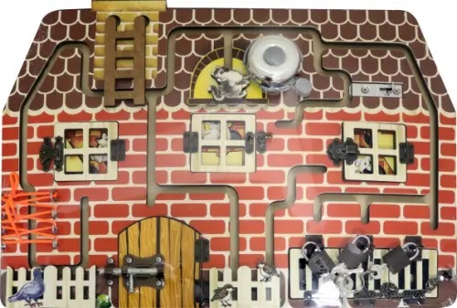 Бизиборд "Кошки-мышки" сочетает в себе: доску с замочками, лабиринт, шнуровку, рамки-вкладыши, увлекательную сюжетную игру. Доска выполнена в виде фасада дома. За каждым окошком прячется мышка с кусочком сыра. Через весь домик проходит дорожка, по которой можно передвигать фигурку кошки. Подойдя к окошку, кошка может схватить мышку - фигурку мышки можно вынуть из отверстия и прикрепить к кошке (фигурка держится за счет магнита). Пойманную мышку кошка может отнести к клетке и запереть её там. Для каждой мышки есть своя клетка (выемка внутри совпадает с силуэтом мышки). Клетки закрываются на замочки. Таким же образом кошка может собрать кусочки сыра, украденные мышками, и отнести их в кладовку, которая находится за дверью. Внутри можно сложить из кусочков целый кусок сыра.