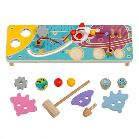 Фигурки планет, шестеренок, летающих тарелок - приносят пользу логическому мышлению, превращая бизиборд в оригинальный деревянный пазл.