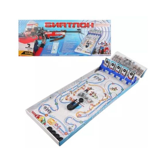 Настольная игра «Биатлон» состоит из игрового поля с размеченной трассой. На поле устанавливается и закрепляется фиксирующей резинкой блок мишеней. Игроки используют фишки, кубик и оружие со снарядами.
