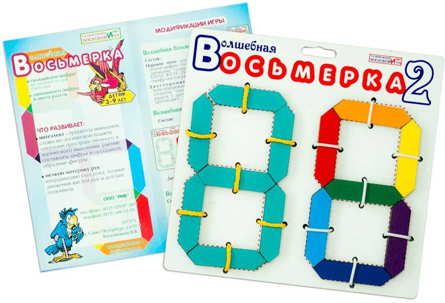Состав: Поле для конструирования цифры (185х180 мм, фанера, пленка, шелкография) с закрепленной резинкой, нанесенным рисунком восьмерки и словами считалки; 14 двусторонних элементов-палочек (фанера, цветная пленка); схемы сложения цифр.