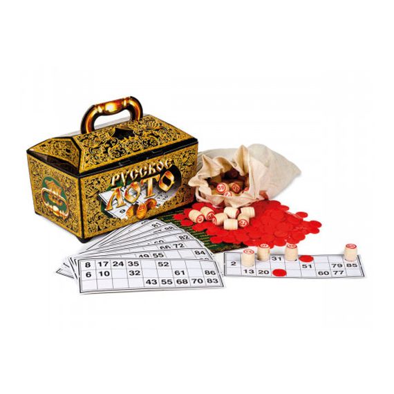 Русское лото в ларце выпускается нами больше 12 лет. Мы начали выпуск настольных игр с бочонками с бюджетных вариантов, удовлетворяя спрос тех наших покупателей, которые берут игры для себя. А вот этот ларец мы выпустили позже и сделали его для тех, кто покупает Русское лото в подарок. Эта настольная игра переместилась в симпатичный ларец, все комплектующие стали солиднее, мешок стал большим и плотным, карточки по белее и поплотнее и бочонки стали проходить дополнительный контроль. Это привело к повышению цены, но не принципиальному. А вот внешний вид лото изменился принципиально, оно стало смотреться богато. Состав игры: - деревянные бочонки - 90 штук; - тканевый мешок - 1 штука; - карточки из картона - 24 штуки; - пластмассовые жетоны - 100 штук; - инструкция -1 штука. Красивая упаковка в виде сказочного ларца имеет размеры 250 на 150 на 180 сантиметров, изготовлена из твердого картона и покрыта лаком.