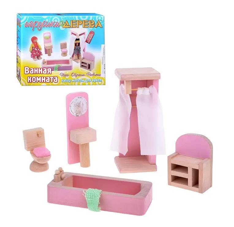 Детский игровой набор состоит из деревянных предметов мебели для кукол: ванной, душевой кабины, унитаза, раковины с зеркалом и туалетного столика.